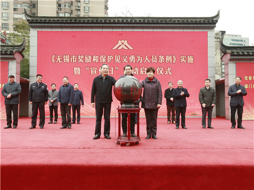 3月1日上午,无锡市公安局、无锡市见义勇为基金会联合市有关部门,在崇安寺二泉广场举办《无锡市奖励和保护见义勇为人员条例》实施暨宣传日活动启动仪式。无锡市人大常委会副主任、党组副书记朱民阳,市政协副主席刘玲,市见义勇为基金会理事长王立人出席仪式,并共同按动《条例》实施启动球,宣布《条例》颁布实施。市公安局党委委员、副局长、政治部主任胡晓主持仪式。