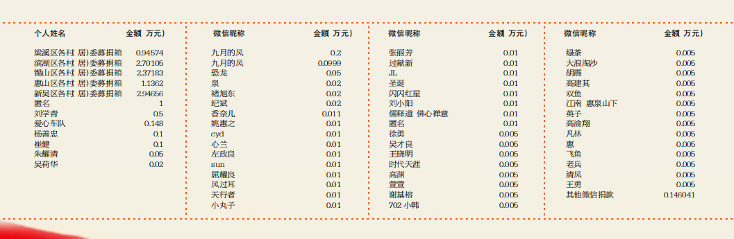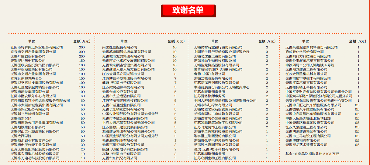 我们礼赞见义勇为英雄、礼赞为见义勇为事业做出贡献的爱心企业、爱心人士。正是这一份份爱心和支持,汇聚成善举洪流在锡城涌动。截止2019年3月31日,全市共有117家企业,3万余名群众捐款共计2635.059321万元。全部捐款已纳入无锡市见义勇为基金会专门账户,用于奖励和保护见义勇为人员。我们将以高度的政治责任感和社会责任感管好用好基金,依法严格管理,规范使用,自觉接受审计、监察、新闻媒体、社会各界的监督。在此,谨向捐款企业和捐款市民致以诚挚的谢意!