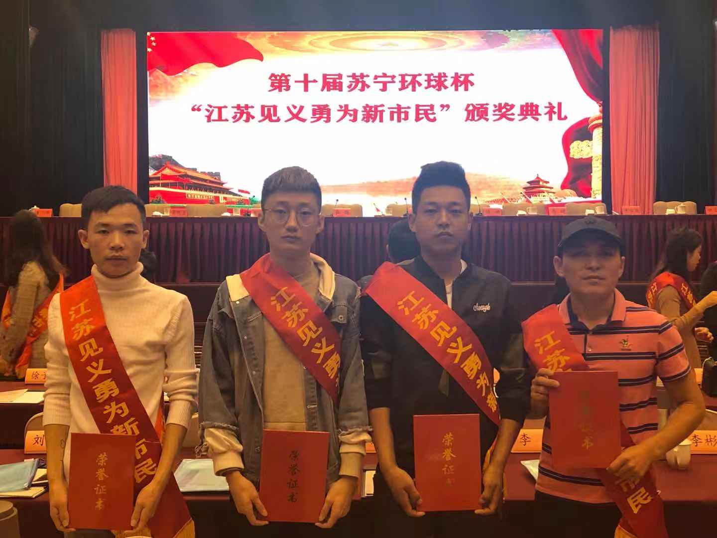 10月25日上午,第十届苏宁环球杯“江苏见义勇为新市民”颁奖典礼在南京召开,我市推荐的覃遵江、刘易南、贺茂飞、徐跃柯4人获评“江苏见义勇为新市民”,他们分别来自湖北、山东、河南等地,是去年以来无锡外来务工人员中见义勇为的先进代表。