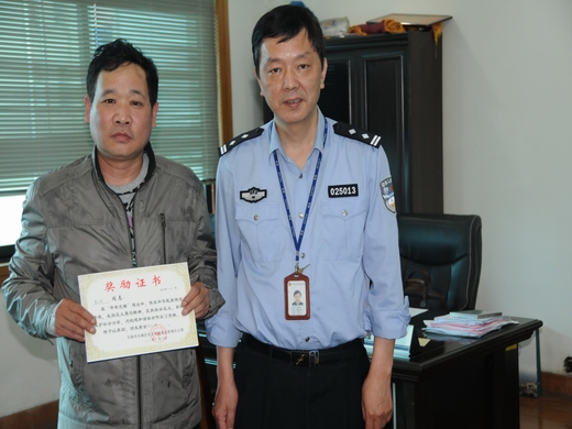 近日,北塘区刘潭派出所见义勇为工作站为奋力擒凶的见义勇为人员夏云祥颁发证书和奖金。