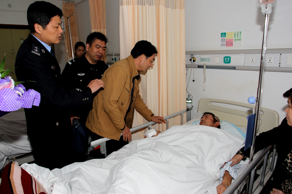 11月5日 上午,宜兴市见义勇为基金会理事长吴国成在市公安局政治处主任谢俊峰等领导的培同下,前往人民医院看望因勇斗持刀歹徒而受伤住院的协警汤国芳。 11月4日 凌晨1时50分左右,十里牌派出所协警汤国芳等人巡逻至金三角车站附近时,发现一名持刀者正挥舞菜刀砍伤路人,汤国芳与同事迅速组成围捕阵势,最终将其制服,但是汤国芳却在与歹徒搏斗中被砍伤。吴理事长等领导高度肯定和赞扬了汤国芳的英勇行为,嘱咐他安心养伤,早日康复并送上了慰问金。据悉,该犯罪嫌疑人乔学华(安徽凤阳人,43岁),伤人动机及案情目前正在审查中。