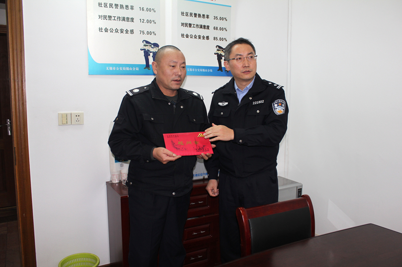 11月17日下午,锡山分局党组副书记、政委张正怿先后至羊尖派出所、东湖塘派出所看望慰问见义勇伤残人员陈渭清、张锡伦,详细询问了他们生活近况,对他们不顾危险、见义勇为的行为和精神表示肯定和赞扬,并送上了抚恤金和救济补助金。期间,张政委还看望慰问了协助警方抓获盗窃犯罪嫌疑人的见义勇为群众计明、钱志杰,向他们颁发了见义勇为奖金及证书,充分肯定了他们见义勇为的先进事迹,并勉励他珍惜荣誉,再接再厉,不断弘扬社会正气,传递见义勇为正能量,为建设更高水平的“平安锡山”、“幸福锡山”作出新的更大的贡献。分局党组成员、政治处主任张国治等领导陪同慰问。