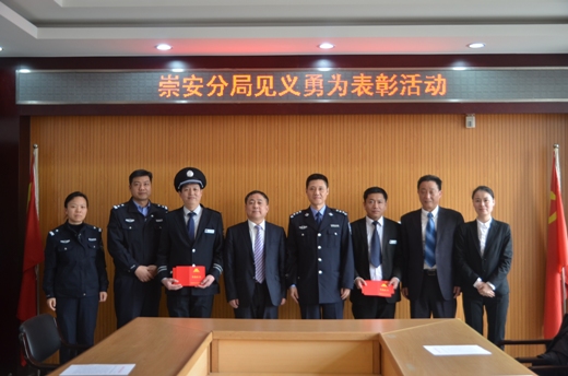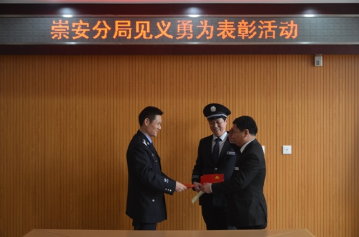 为进一步弘扬正气,表彰见义勇为精神,3月17日下午,受市见义勇为基金会委托,崇安见义勇为工作办公室为崇实物业保安蒋建军、曹志伟颁发见义勇为证书及奖金,对他们的见义勇为行为表示充分肯定,并勉励他们继续发扬见义勇为精神,为建设平安和谐社会多做贡献。