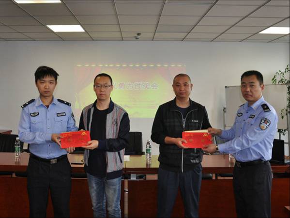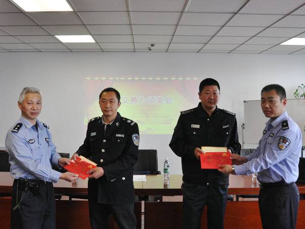 为弘扬社会正义,倡导见义勇为善举,受市见义勇为基金会委托,5月18日上午,溪南派出所在辖区华东大厦召开见义勇为表彰会,分别表彰大厦物业保安陈勇、谢其雨,和辖区中信银行保安梁建红、笪玉立,为他们颁发了奖励证书和奖金。